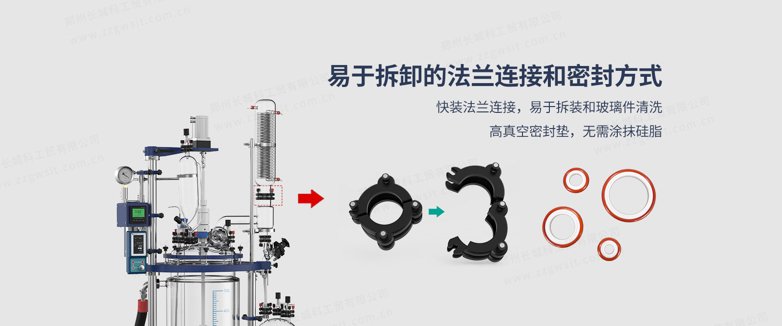 4、便捷的固料開啟方式:高硼硅玻璃堵頭,易于清潔,耐腐蝕性更好,不銹鋼快開卡扣,使投料和拆卸過程方便,密封采用包氟O型圈,無需涂抹硅脂;