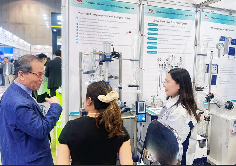 開展首日,長城科工貿展位人氣持續走高,此次帶來的“明星陣容”成為了現場焦點,全方位展示了我們在實驗室溫控、反應合成、蒸餾提純等領域的技術積累與創新成果,吸引了眾多韓國本土及海外客商駐足咨詢。公司專業技術團隊現場一對一深度講解產品性能,精準對接海外市場個性化需求,現場收獲廣泛認可與大量合作意向。